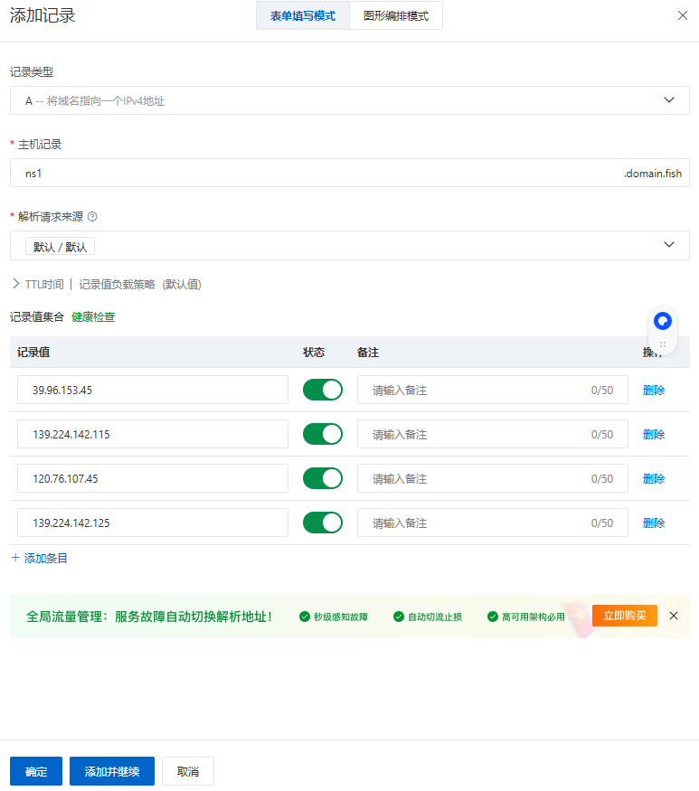 打开阿里云官网 云解析DNS 里面增加域名,我增加了domain.fish这个域名,然后增加解析记录,和注册域名服务器一样把所有的IP都添加进去,IPV4就选A记录类型;IPV6就选AAAA记录类型。主机记录就是上一步的NS1和NS2。