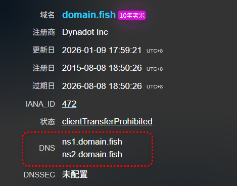 添加完毕后我顺手把域名的DNS改为了ns1.domain.fish、ns2.domain.fish